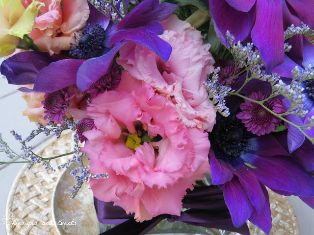 Here you can see the lisianthus and sea heather up close. The sea heather broke up the solid purple of the anemones, which gave the whole look some extra dimension.