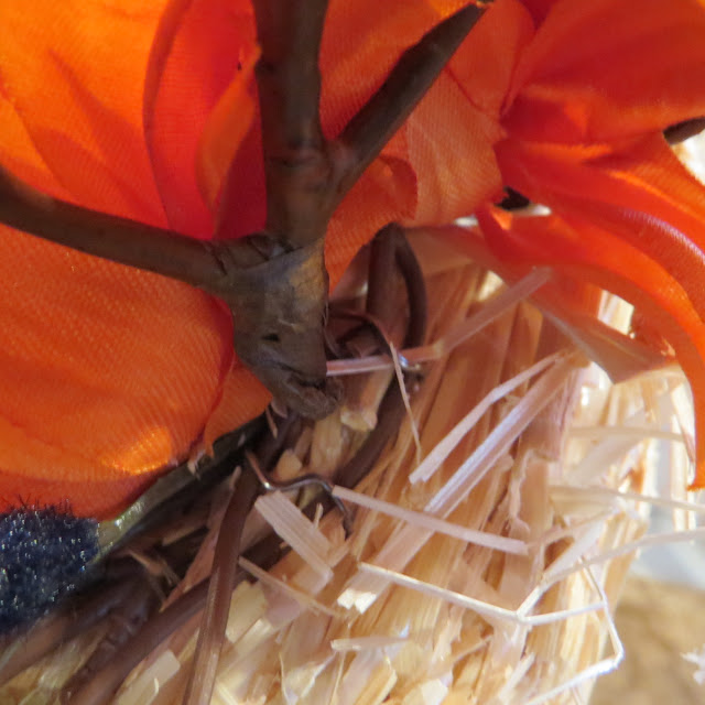 Originally, I was worried about using these silk flowers because the stems were very thick and I wasn't sure how I would keep them in place on the wreath. What I discovered was the stems punctured the straw wreath quite well and were very easy to put in place. I added a dollop of hot glue to make sure they stayed exactly where I wanted them and wouldn't fall out unexpectedly. This system worked out perfectly.