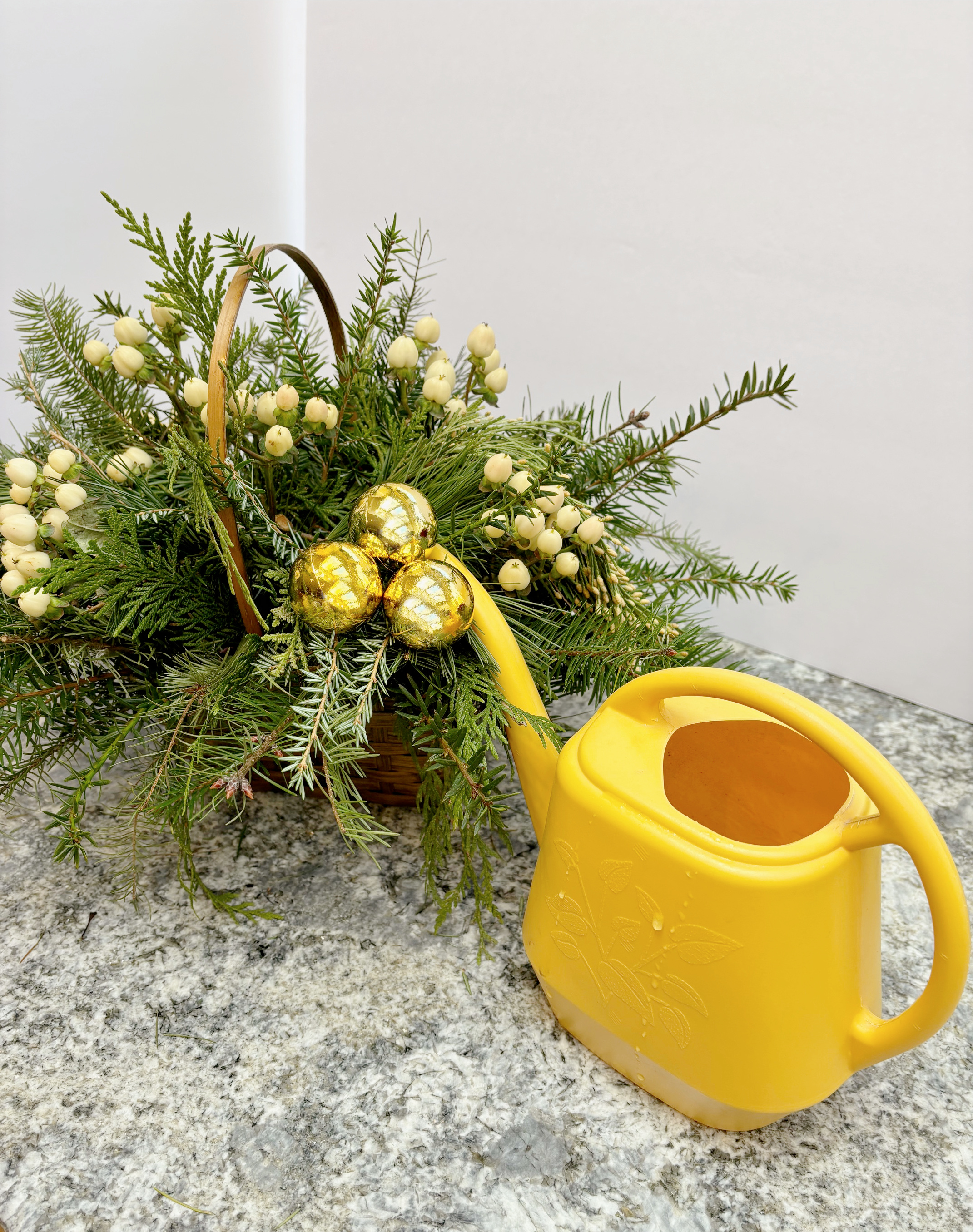 I left the gold balls and white hypericum berries in the arrangement. That was my plan all along. I did have to trim that one bad white berry out. You can see it in this photo below. A quick snip and we are all set to go.