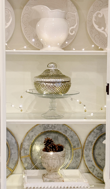 I lined the shelves with a variety of string lights. They added just enough light here too.
